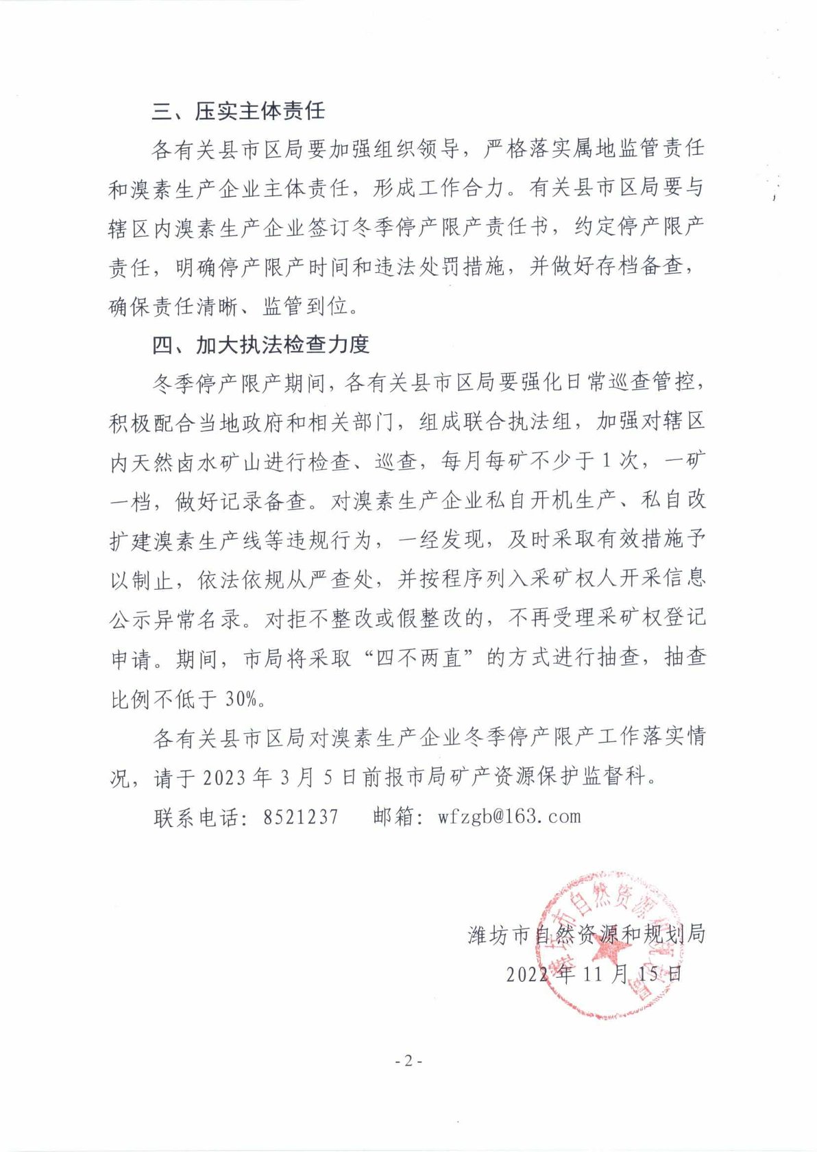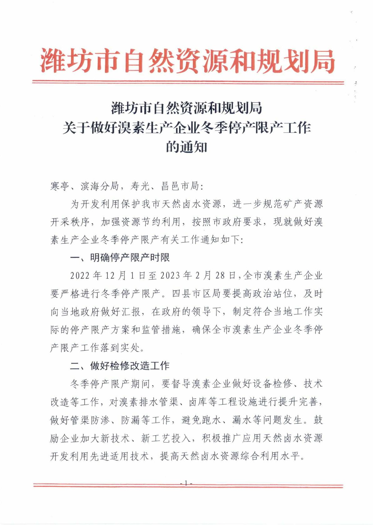 潍坊市自然资源和规划局关于做好溴素生产企业冬季停产限产工作的通知